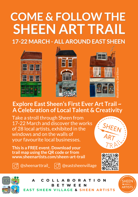 East Sheen’s small independent business community (East Sheen Village) and the Sheen Artists grouphave joined forces to create Sheen Art Trail, connecting a variety of local businesses and artists who will display their work in shop windows and interiors.