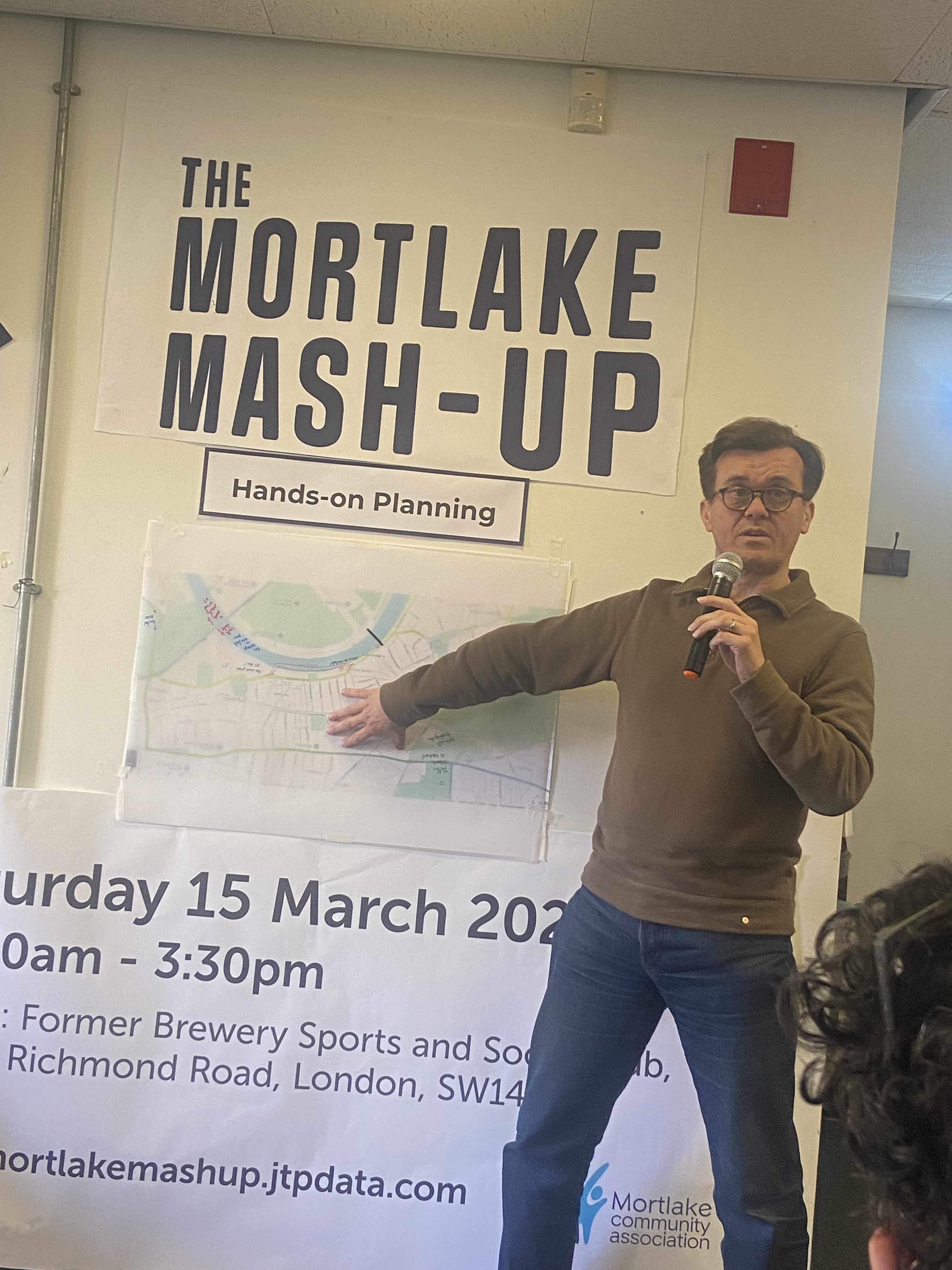 Damian Keogh (Co-Founder of the Story Collective, whose film studios are working on the site, speaking), Francine Bates (Chair Mortlake Community Association) and Charles Campion (JTP Community Planning Team) welcome participants to the Mash-Up.
