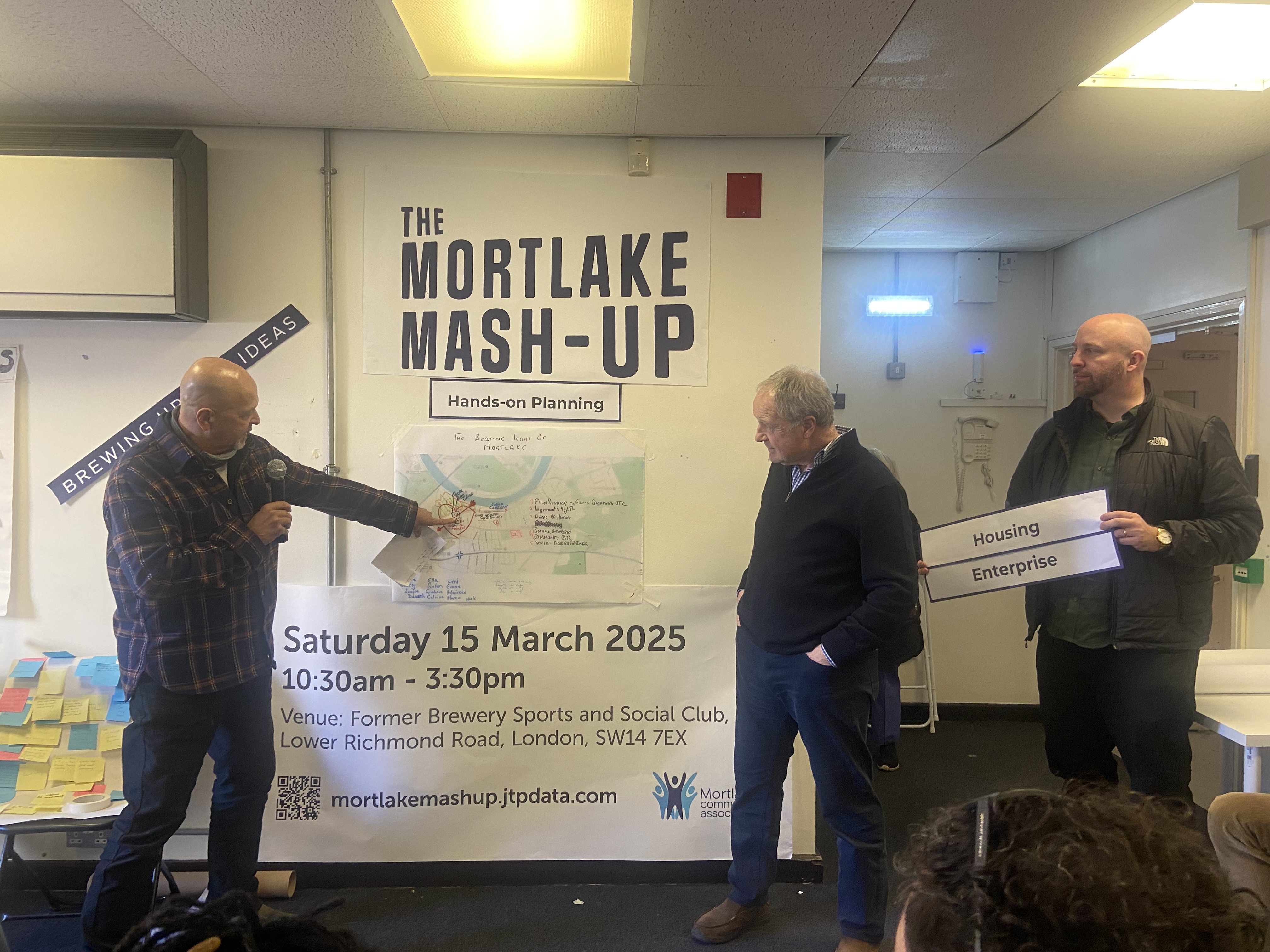 Jonathan Perry, Nick Taylor and Nick Davies below presenting enterprising ideas about the heart of Mortlake, proposing it should be close to Mortlake Green.