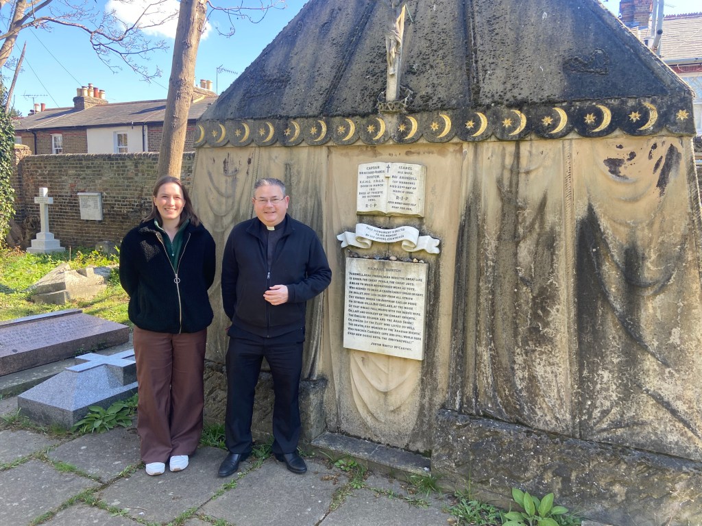 Inside the Church you can find the stained-glass Burton Memorial Window. This was given by his widow Lady Isobel nee Arundell. She was a staunch Catholic and several members of her family are buried in the cemetery. She had previously visited Portobello House, whose owner helped to found the church in 1852. Richard Burton was not a Catholic but in order to save his soul his wife ensured that the last rites were administered to him when he was on his death bed.