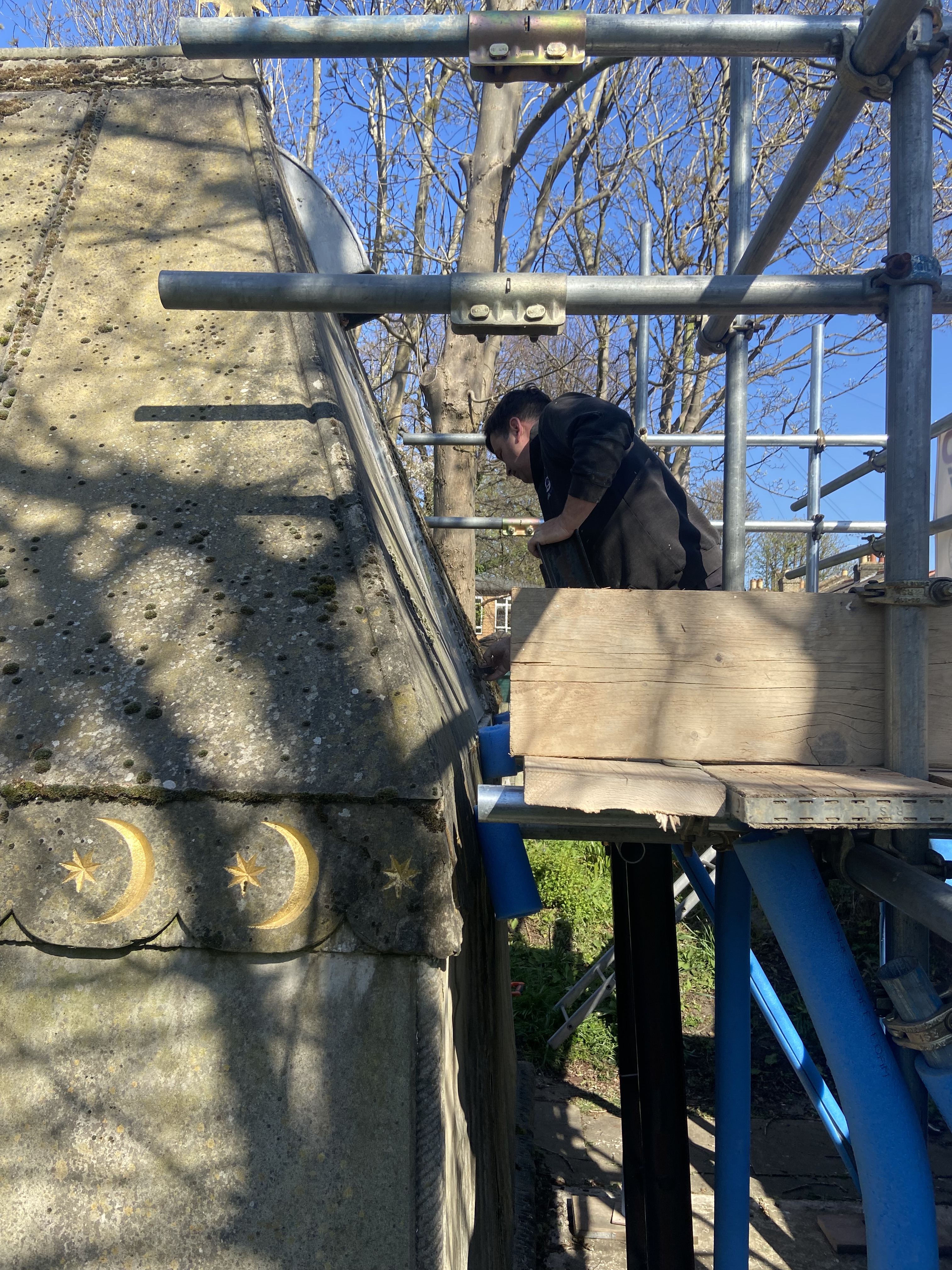 The second surprise was to see the scaffolding in place with a contractor unscrewing the glass window to the mausoleum. The third surprise was to hear that tomorrow, Thursday, an assessment of the work necessary for the renovation will be undertaken. The project should be finished during the summer.