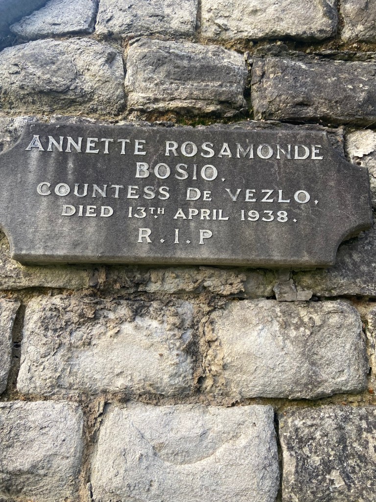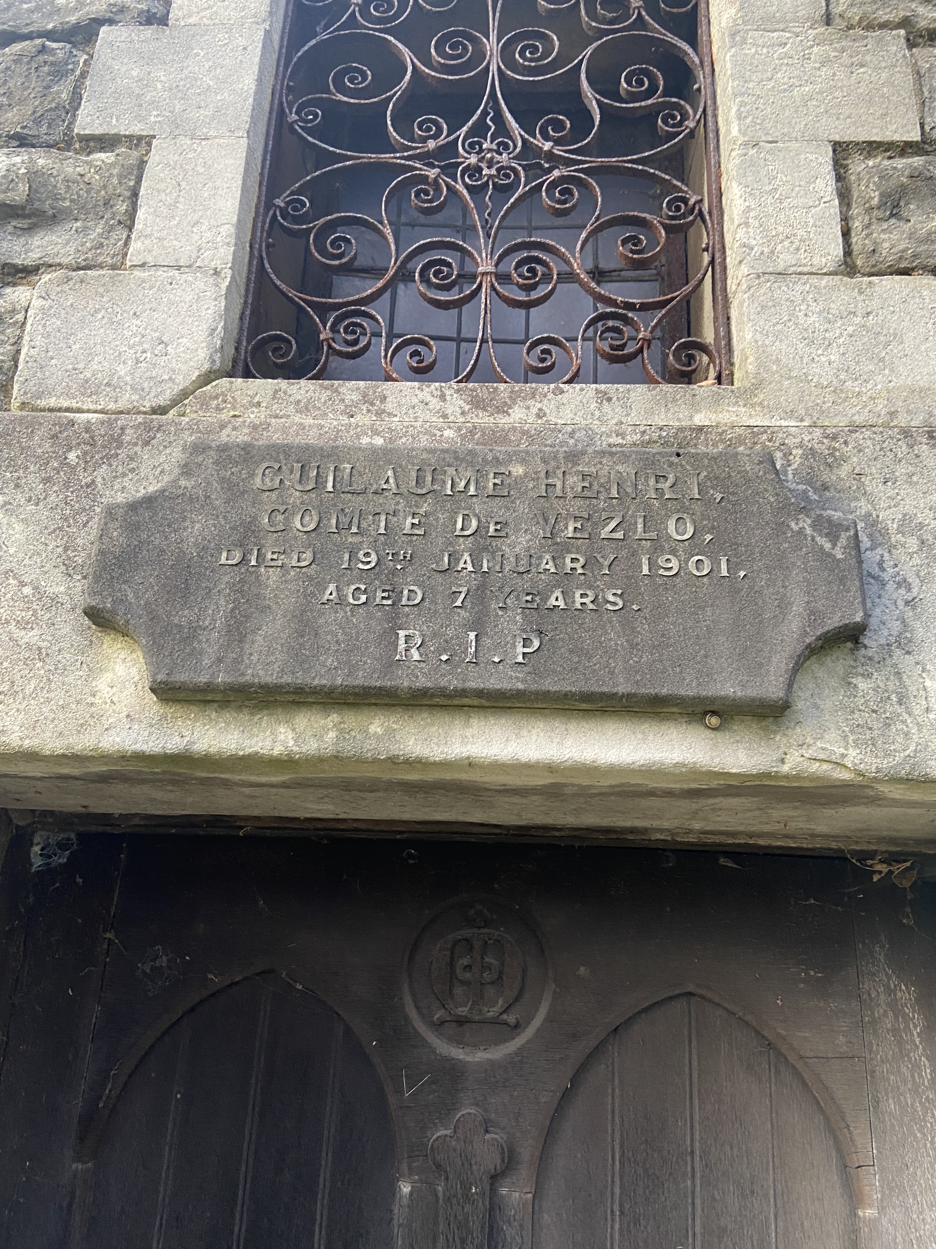 This mausoleum was built to commemorate Guilaume Henri, Comte de Vezlo (1894-1901), who died aged seven. Beside his plaque is another referring to his mother the Comtesse de Vezlo (d.1938).