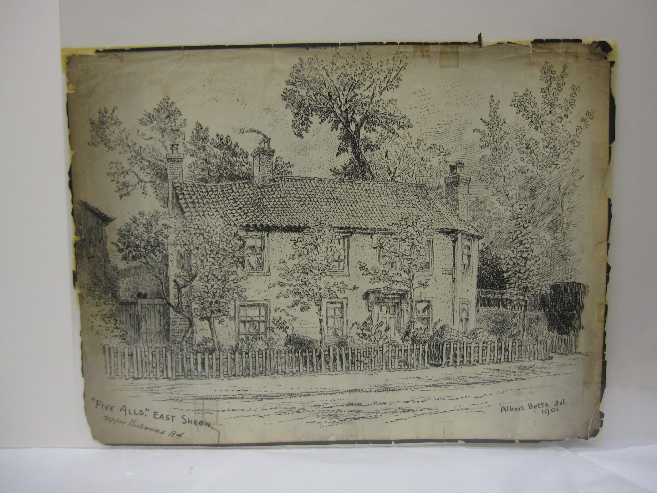 This picture is exhibited in the Orleans House Gallery in Twickenham. The subject is the Five Alls Pub in East Sheen.