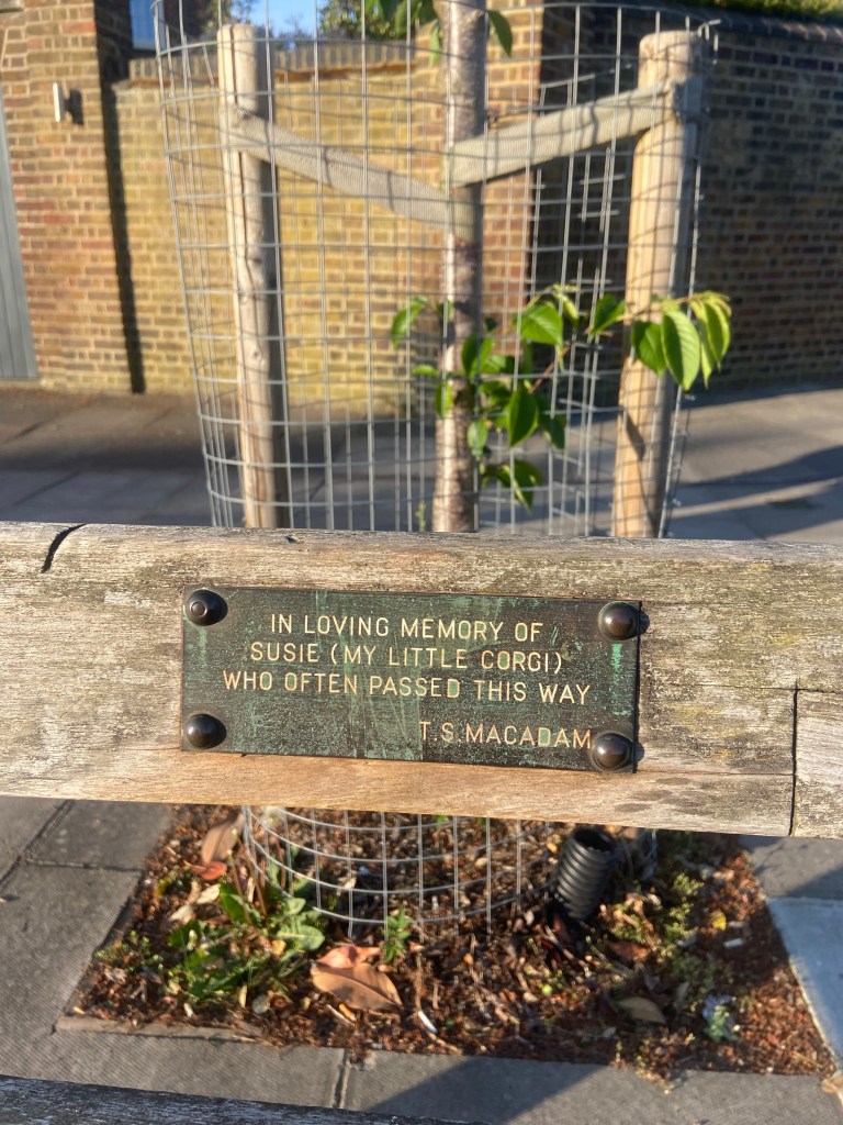 As can be seen in the photo below there is a bench in front of the tree with a memorial to Susie, a beloved Corgi, donated by the owner T. S. Macadam. Does anyone know of Susie or Macadam?