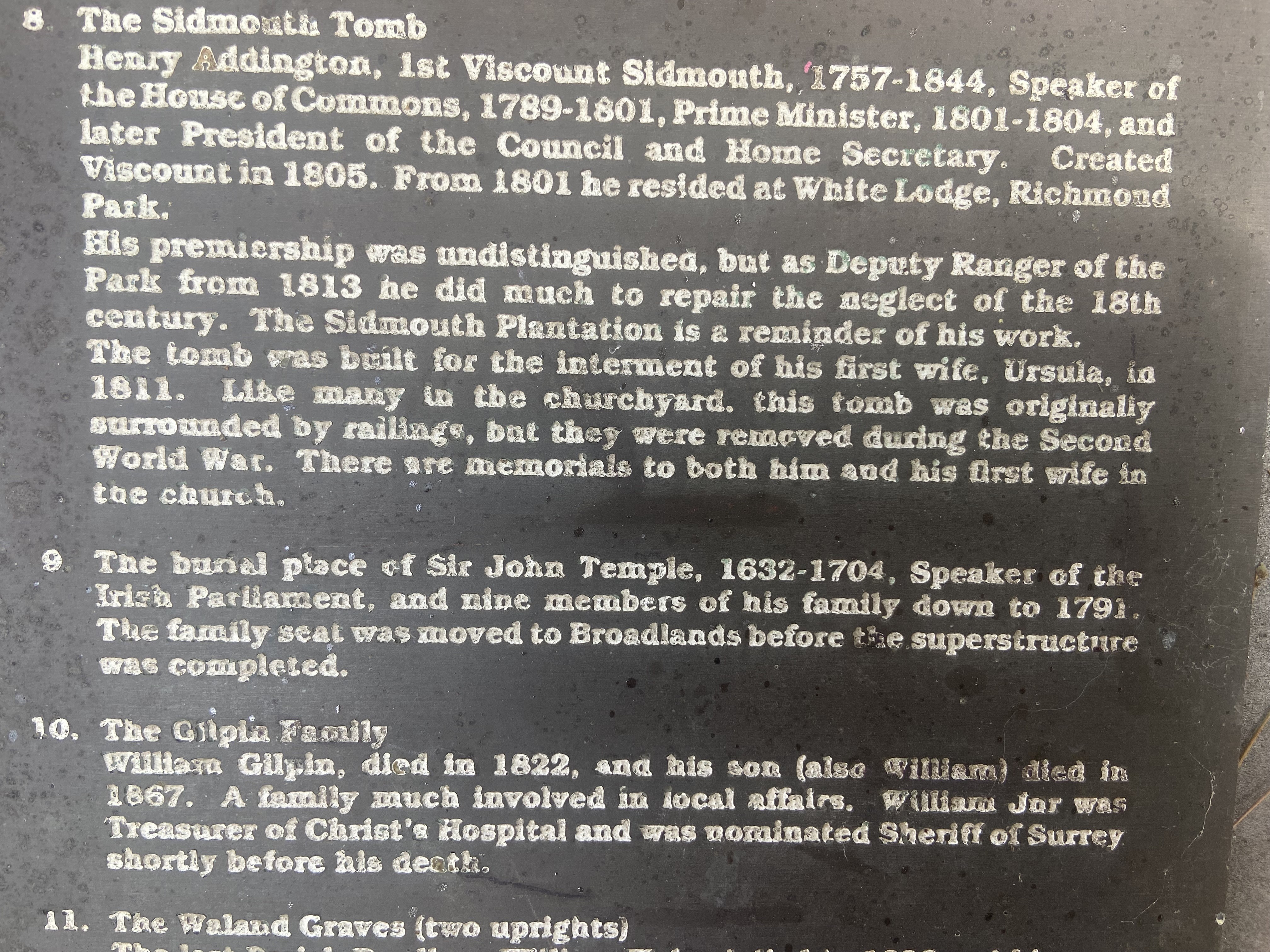 The Sidmouth Tomb lies in the graveyard of St. Mary the Virgin in Mortlake. The inscriptions on his Tomb are indecipherable. But fortunately the plaque shown below in the middle of the graveyard provides us with the essential details.