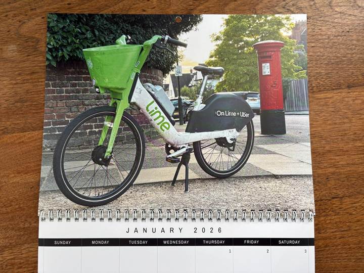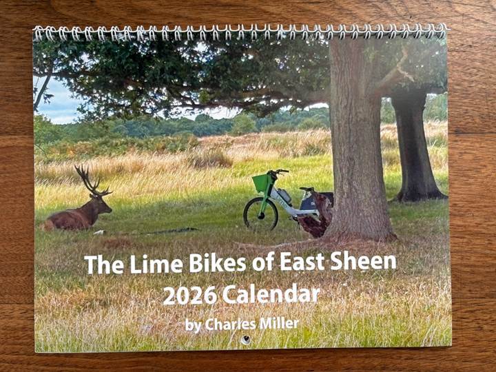 It’s the 2026 The Lime Bikes of East Sheen calendar. Produced with a careful balance of pictures of the invading species in both celebratory and shameful poses, the calendar is sure to provoke laughs and controversy over the Christmas dinner.