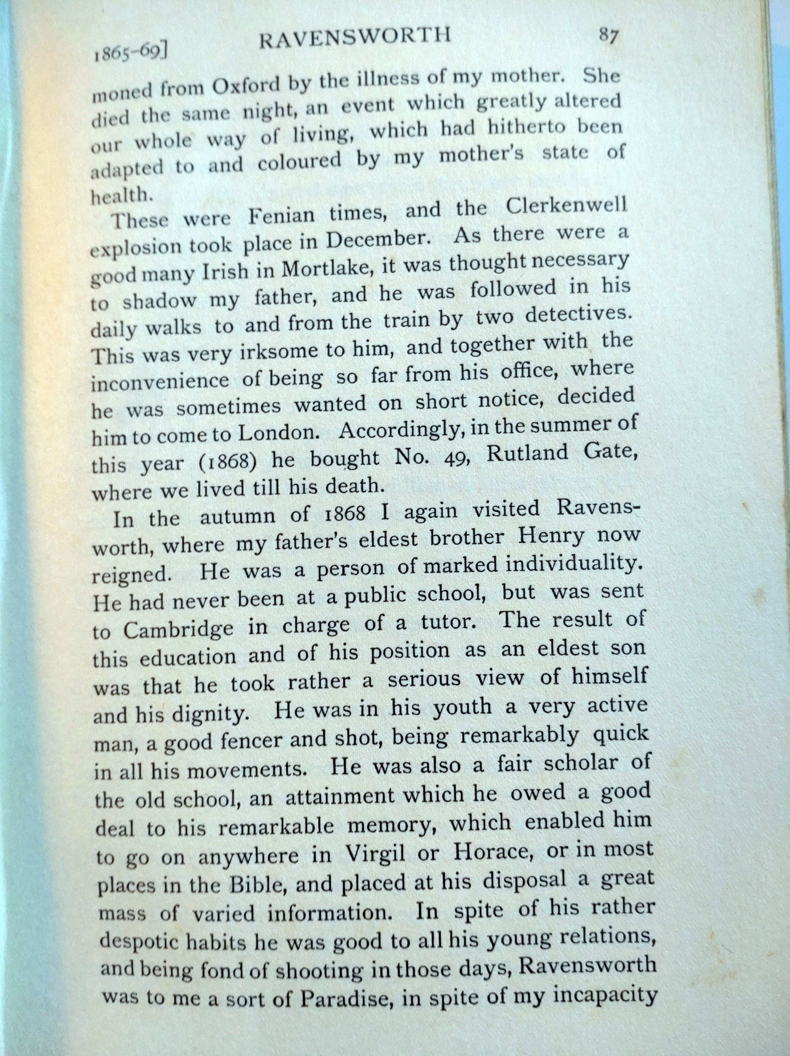 As regards the Mortlake brewery, there were a number of Irish labourers employed there in the 1860s. The following pages (extracts) of the autobiography of Adolphus Liddell, whose grave and that of his parents Sir Adolphus Liddell and Frederica Lane Fox and of his younger brother is in the Old Mortlake burial ground, reflects some of the concerns of the authorities in the Fenian times. The elder sister of Adolphus, Frederica Lascelles (nee Liddell), was the mother of my grandfather, Sir Alan ‘Tommy’ Lascelles.