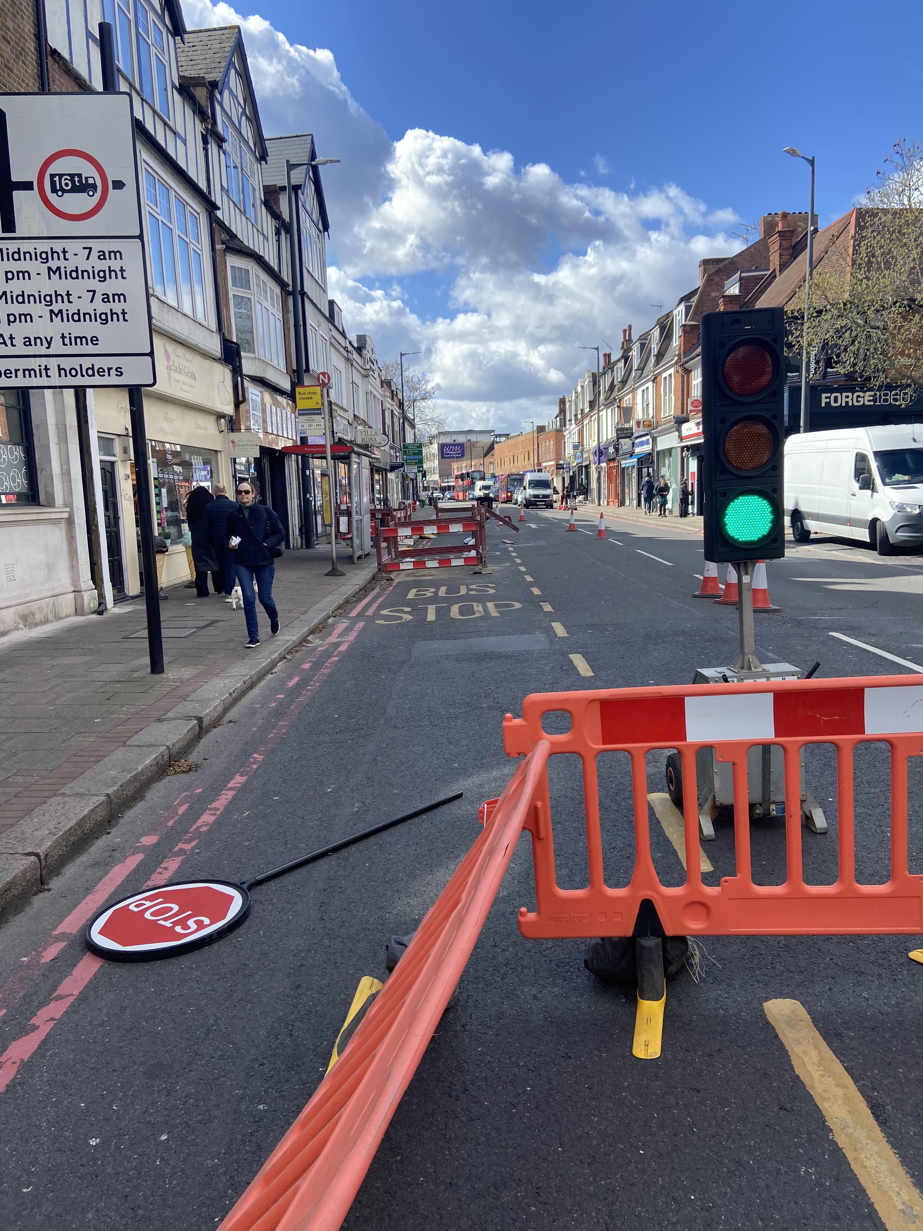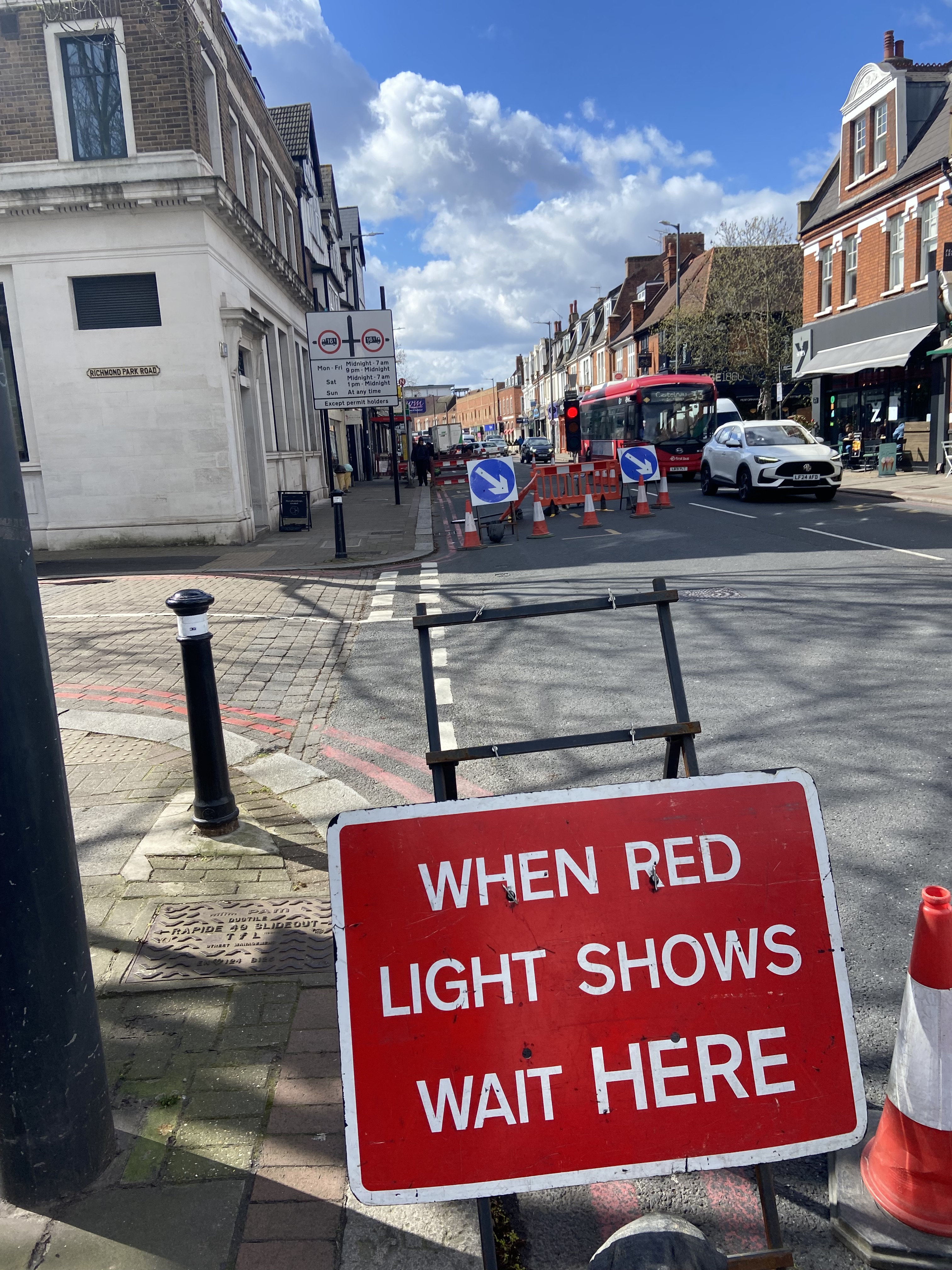“Rush hour traffic on the Upper Richmond Road was again held up by traffic lights [this time] outside Sheen Sports. Having passed the traffic lights at 1pm, complete with attendant queues of traffic, I can report that not only is there no one working there but the job on the pavement is complete. The barriers and lights are serving no purpose other than to make life difficult and frustrating for thousands of road users.”