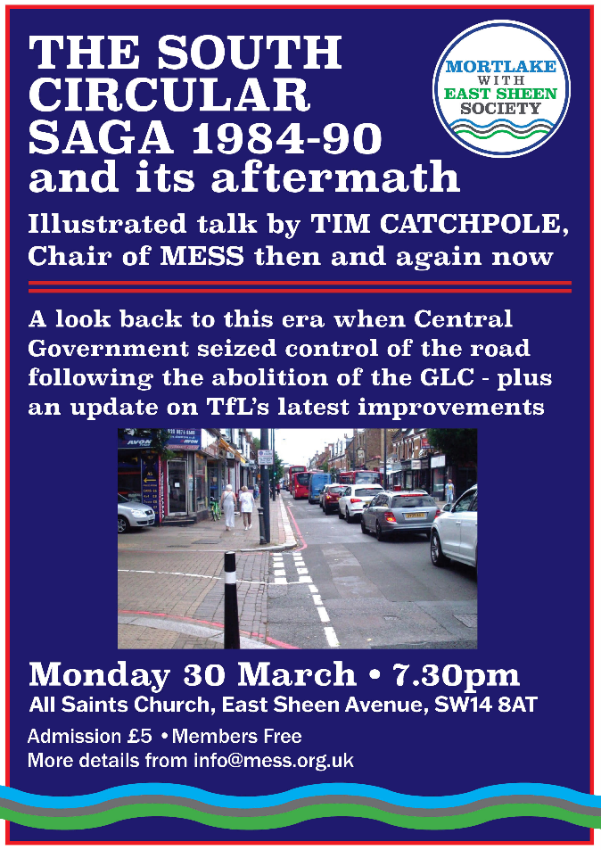 The talk by MESS Chair will be held at All Saints Church and will start at 7.30pm. Forty years ago almost to the day the GLC, who managed the South Circular, was abolished and the Government seized control of the road. Residents of Mortlake, East Sheen, Barnes and Kew dreaded what was going to happen next and MESS engaged in the battle, with the Chair in the vanguard.